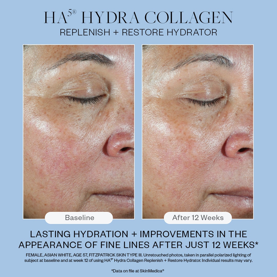 - HA⁵® Hydra Collagen Replenish + Restore Hydrator attracts and retains water for instant hydration and visibly plump, smooth skin